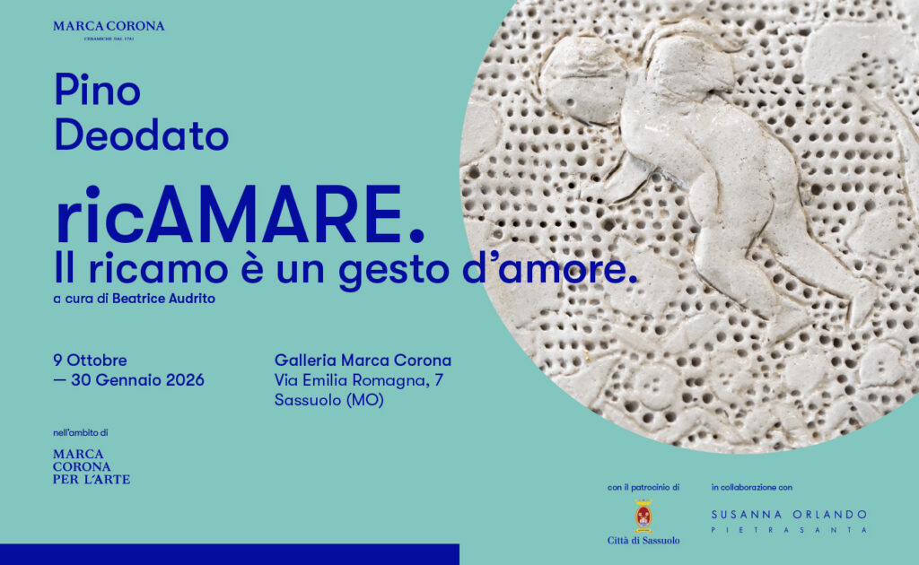 Per la quarta edizione di Marca Corona per l’Arte, Pino Deodato ha ideato ricAMARE. Il ricamo è un gesto d’amore, un’opera site-specific che unisce tradizione, innovazione e identità. L’artista ha reinterpretato il gesto lento e meditativo del ricamare – eterno simbolo di cura e dedizione – nel linguaggio della terracotta.