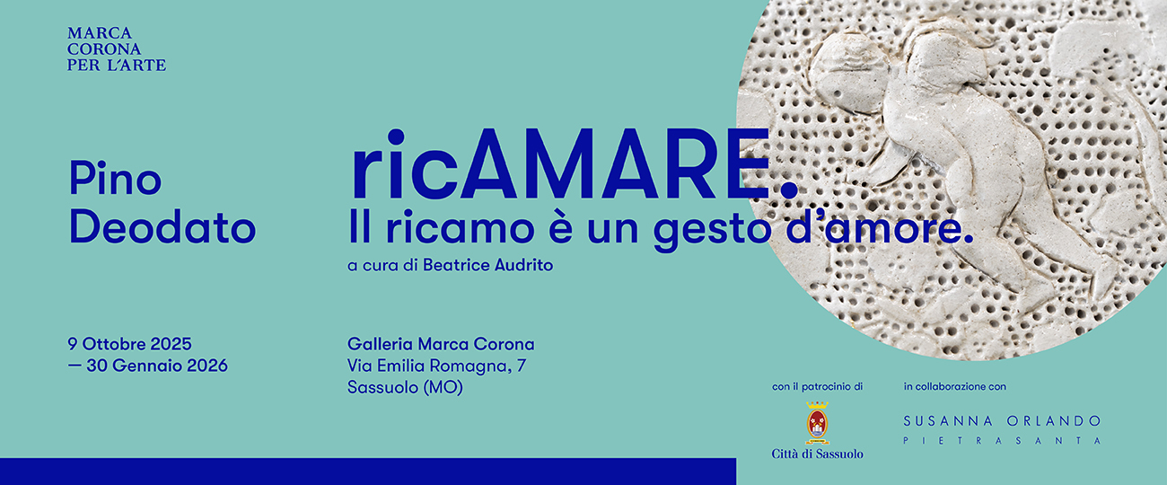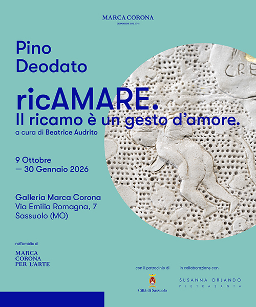 Per la quarta edizione di Marca Corona per l’Arte, Pino Deodato ha ideato ricAMARE. Il ricamo è un gesto d’amore, un’opera site-specific che unisce tradizione, innovazione e identità. L’artista ha reinterpretato il gesto lento e meditativo del ricamare – eterno simbolo di cura e dedizione – nel linguaggio della terracotta. Nasce così un grande ricamo contemporaneo, composto da nove bassorilievi in terracotta invetriata bianca arricchiti da foglia oro, affiancati da due sculture che evocano l’intimità dello studio dell’artista.